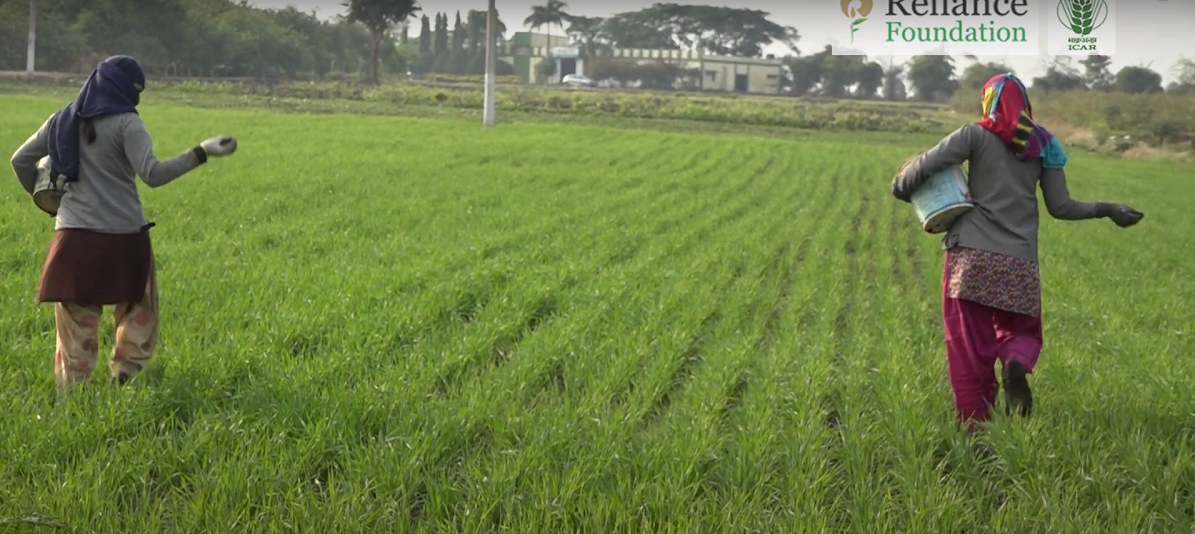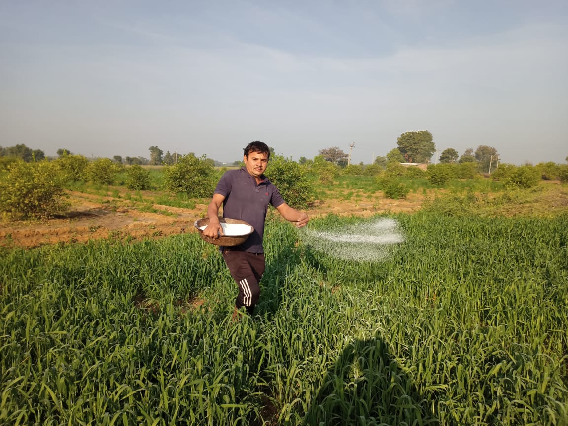 नमस्कार, किसान भाईयों व बहनों, रिलायंस फाउंडेशन और कृषि विज्ञान केंद्र रायसेन के सहयोग से किसानो को सलाह है की, सिंचित गेहूं की बोनी हेतु 130 किलोग्राम डी.ए.पी, 166 किलोग्राम यूरिया एवं 67 किलोग्राम म्यूरेट आफ पोटाश का प्रति हेक्टेयर के हिसाब से छिड़काव करें।