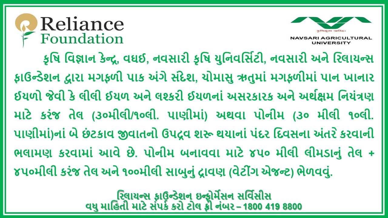 નમસ્કાર, કૃષિ વિજ્ઞાન કેન્દ્ર, વઘઈ, નવસારી કૃષિ યુનિવર્સિટી, નવસારી અને રિલાયન્સ ફાઉન્ડેશન દ્વારા મગફળી પાક અંગે સંદેશ, ચોમાસુ ઋતુમાં મગફળીમાં પાન ખાનાર ઈયળો જેવી કે લીલી ઈયળ અને લશ્કરી ઈયળનાં અસરકારક અને અર્થક્ષમ નિયંત્રણ માટે કરંજ તેલ (૩૦મીલી/૧૦લી. પાણીમાં) અથવા પોનીમ (૩૦ મીલી ૧૦લી. પાણીમાં)નાં બે છંટકાવ જીવાતનો ઉપદ્રવ શરૂ થયાનાં પંદર દિવસના અંતરે કરવાની ભલામણ કરવામાં આવે છે. પોનીમ બનાવવા માટે ૪૫૦ મીલી લીમડાનું તેલ + ૪૫૦મીલી કરંજ તેલ અને ૧૦૦મીલી સાબુનું દ્રાવણ (વેટીંગ એજન્ટ) ભેળવવું. વધુ માહિતી મેળવવા માટે રિલાયન્સ ફાઉન્ડેશન ના ટોલ ફ્રી નંબર ૧૮૦૦ ૪૧૯ ૮૮૦૦ ઉપર સંપર્ક કરવા વિનંતી, આભાર.