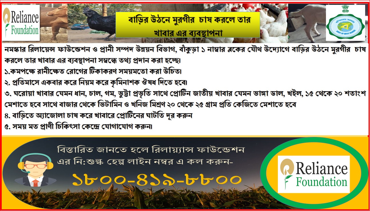 নমস্কার রিলায়েন্স ফাউন্ডেশন ও প্রানী সম্পদ উন্নয়ন বিভাগ, বাঁকুড়া ১ নাম্বার ব্লকের যৌথ উদ্যোগে বাড়ির উঠনে মুরগীর চাষ করলে তার খাবার এর ব্যবস্থাপনা সম্বন্ধে তথ্য প্রদান করা হচ্ছে।