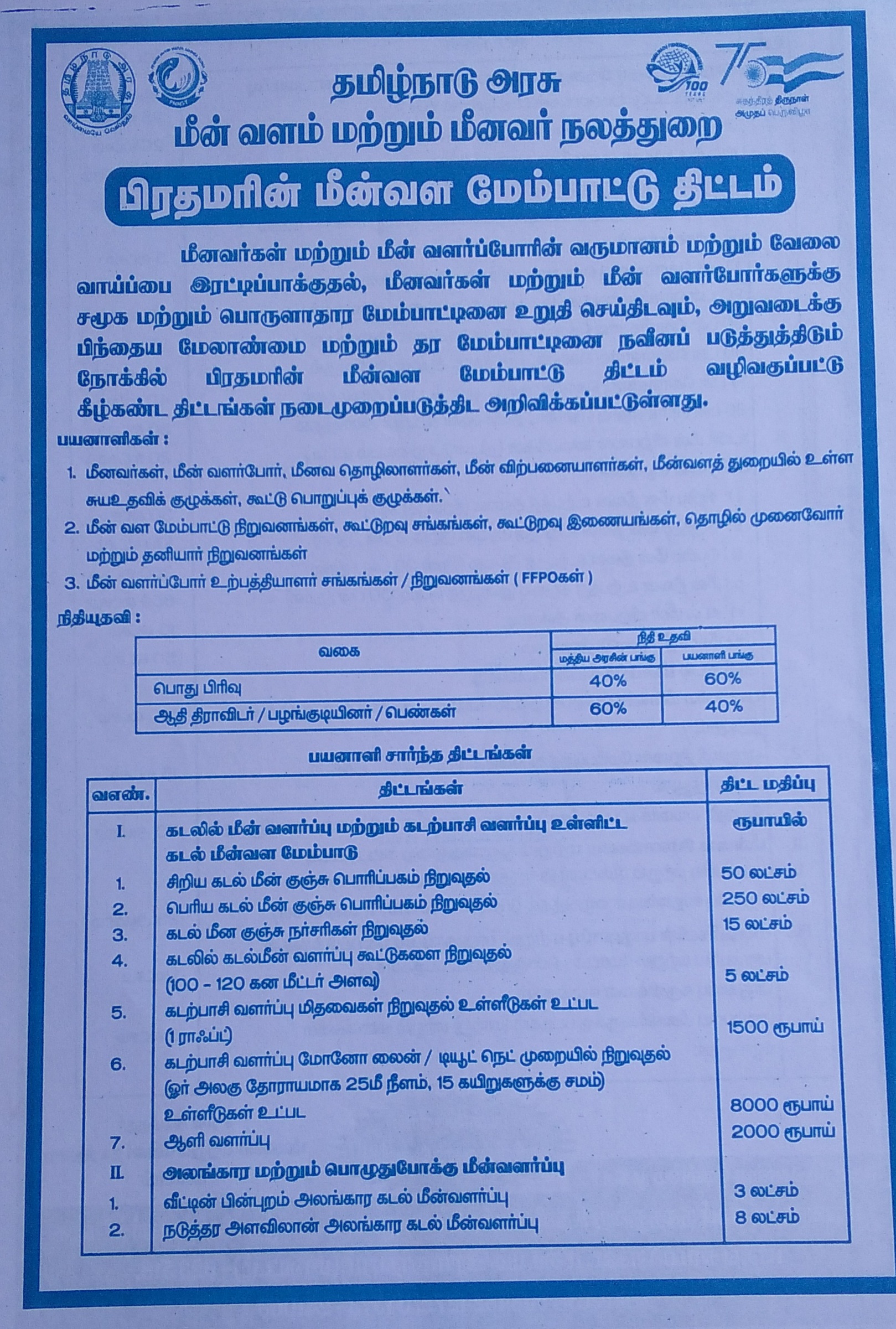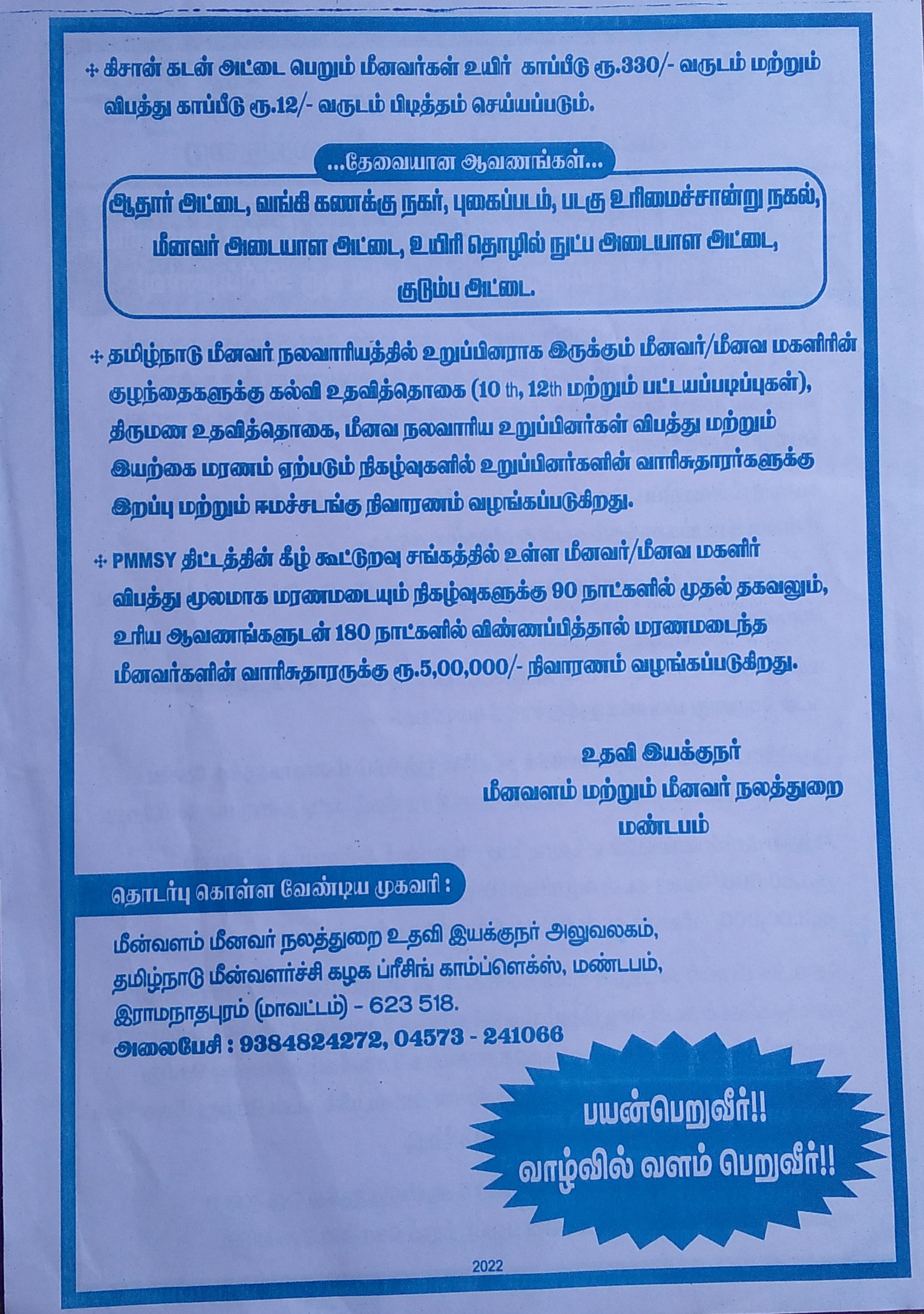 மீன்பிடி விசைப்படகு/ நாட்டுப்படகுகளின் நடைமுறை செலவினங்களான டீசல், பனிக்கட்டி, கூலி மற்றும் இதர இனங்களுக்கு தேவையான கடன் உதவியை வங்கிகள் மூலம் பெறுவதற்கு மீனவர்களுக்கான கிசான் கடன் அட்டை பெரிதும் உதவுகிறது. கூண்டு மீன்வளர்ப்பு, அலங்கார மீன்வளர்ப்பு, கடற்பாசி வளர்ப்பு மற்றும் இதர மீன்வள திட்டங்களுக்கும் கடன் அளிக்கப்படுகிறது. மீனவர்கள் தங்கள் கணக்கு வைத்துள்ள வங்கிகளிலேயே இந்த கடன் அட்டையை பெறலாம்.மத்திய அரசு உதவியுடன் குறைந்த வட்டியில் அதாவது 7 சதவீதம் வட்டியில் கடன் பெறுவது மீனவர்களுக்கு சாத்தியமாகிறது.கு றிப்பிட்ட காலக்கெடுவில் வங்கிக் கடன் செலுத்திடும் மீனவர்களுக்கு தேசிய மயமாக்கப்பட்ட வங்கிகளின் மத்திய அரசு 2 சதவீதம் வட்டி தள்ளுபடி செய்கிறது. இதிய ரிசர்வ் வங்கியின் உத்தரவுப்படி அடமானம் இல்லாமல் தற்போது ரூ.1,80,000/- வரை கடன் வழங்கப்படுகிறது. அடமானத்தின் பேரில் ரூ.3,00,000/- மீனவர் கடன் அட்டையில் (KCC) கடன் பெறலாம். தொடக்க மீனவர் கூட்டுறவு சங்கங்களின் கடன் பெறும் மீனவர்களின் குறிப்பிட்ட காலக்கெடுவில் கடன் செலுத்தும் மீனவர்களுக்கு 7 சதவீத வட்டியில் மத்திய அரசு பங்களிப்பு 3 சதவீதத்தோடு, ஊக்கதொகையாக 3 சதவீதம் தள்ளுபடி செய்து இறுதியாக 4 சதவீதம் (58 பைசாவில்) கிசான் அட்டையில் கடன் பெற்று மீனவர்கள் பயனடைய அன்புடன் கேட்டுக்கொள்ளப்படுகிறது. ஒருமுறை கிசான் கடன் அட்டை பெற்றவர் 5 ஆண்டுகளுக்கு ஒரு முறை ஆவணங்களை காண்பித்து கடனை புதுப்பித்துக் கொள்ள வேண்டும். கிசான் கடன் அட்டை பெறும் மீனவர்கள் உயிர் காப்பீடு ரூ.330/-வருடம் மற்றும் விபத்து காப்பீடு ரூ.12/- வருடம் பிடித்தம் செய்யப்படும். மீனவர் கடன் அட்டைக்கு விண்ணப்பிக்க (KCC) தேவையான ஆவணங்களான ஆதார் அட்டை, வங்கி கணக்கு நகல், புகைப்படம், படகு உரிமைச்சான்று நகல், மீனவர் அடையாள அட்டை, உயிரி தொழில் நுட்ப அடையாள அட்டை மற்றும் குடும்ப அட்டை கொண்டு விண்ணப்பிக்கலாம். மேலும் தகவல்பெற1800 419 8800 என்ற எண்ணை தொடர்பு கொள்ளவும்.